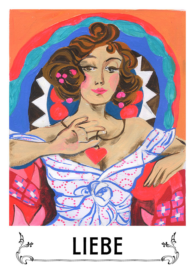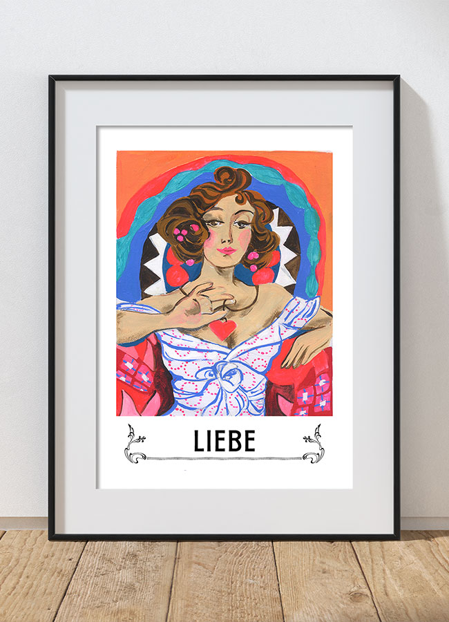 „Liebe“ ist Teil meiner Illustrationsreihe, inspiriert von den 20er-Jahre-Plakaten von Alphonse Mucha – die Motive findest du auch als Kalender in meinem Shop.